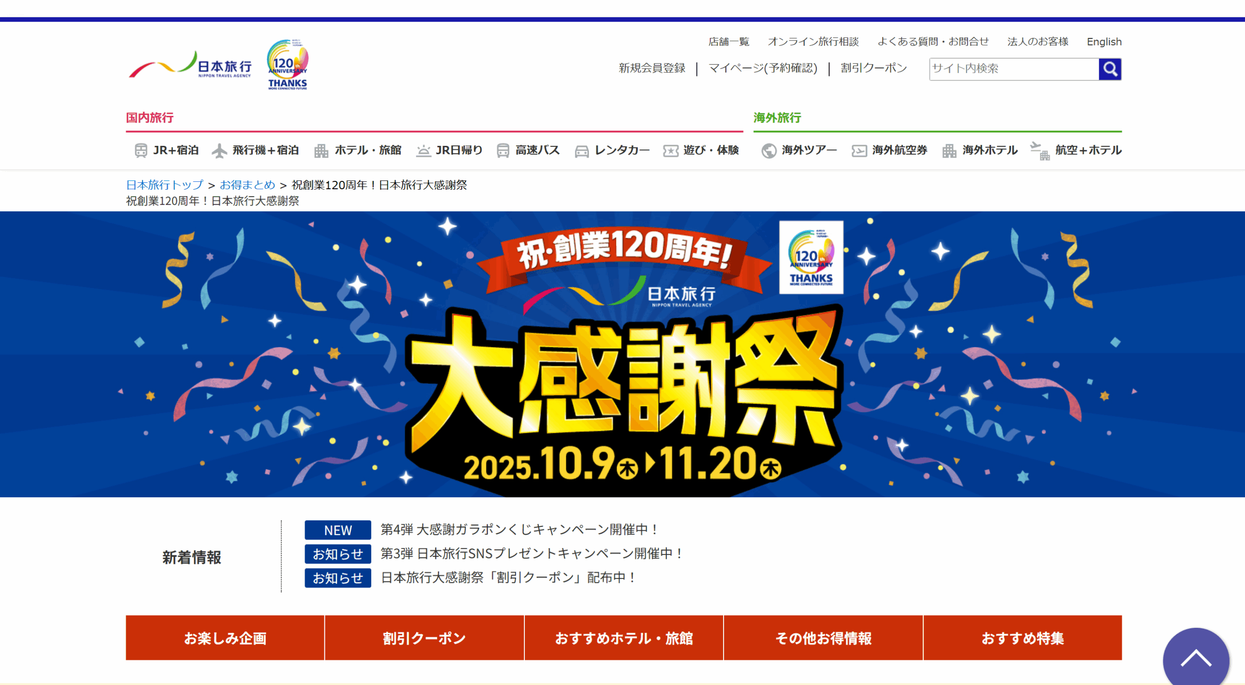 「旅に出たいけれど、プランを立てる時間がない」「宿泊もツアーも安心して任せたい」「海外も国内も幅広く探したい」――そんな方におすすめなのが、創業1905年(明治38年)から続く総合旅行会社、株式会社日本旅行(日本旅行)の旅のサービスです。