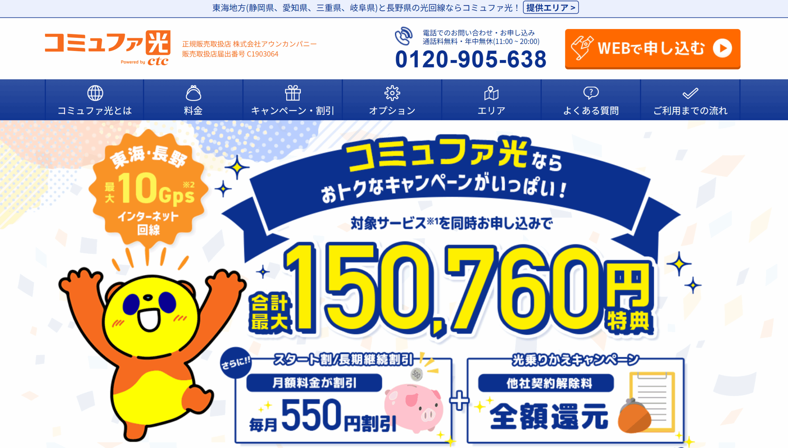 中部電力グループの株式会社コミュファが提供する光回線サービスで、東海エリア(愛知・岐阜・三重・静岡・長野)を中心に、圧倒的な通信速度と安定性で高い評価を得ています。