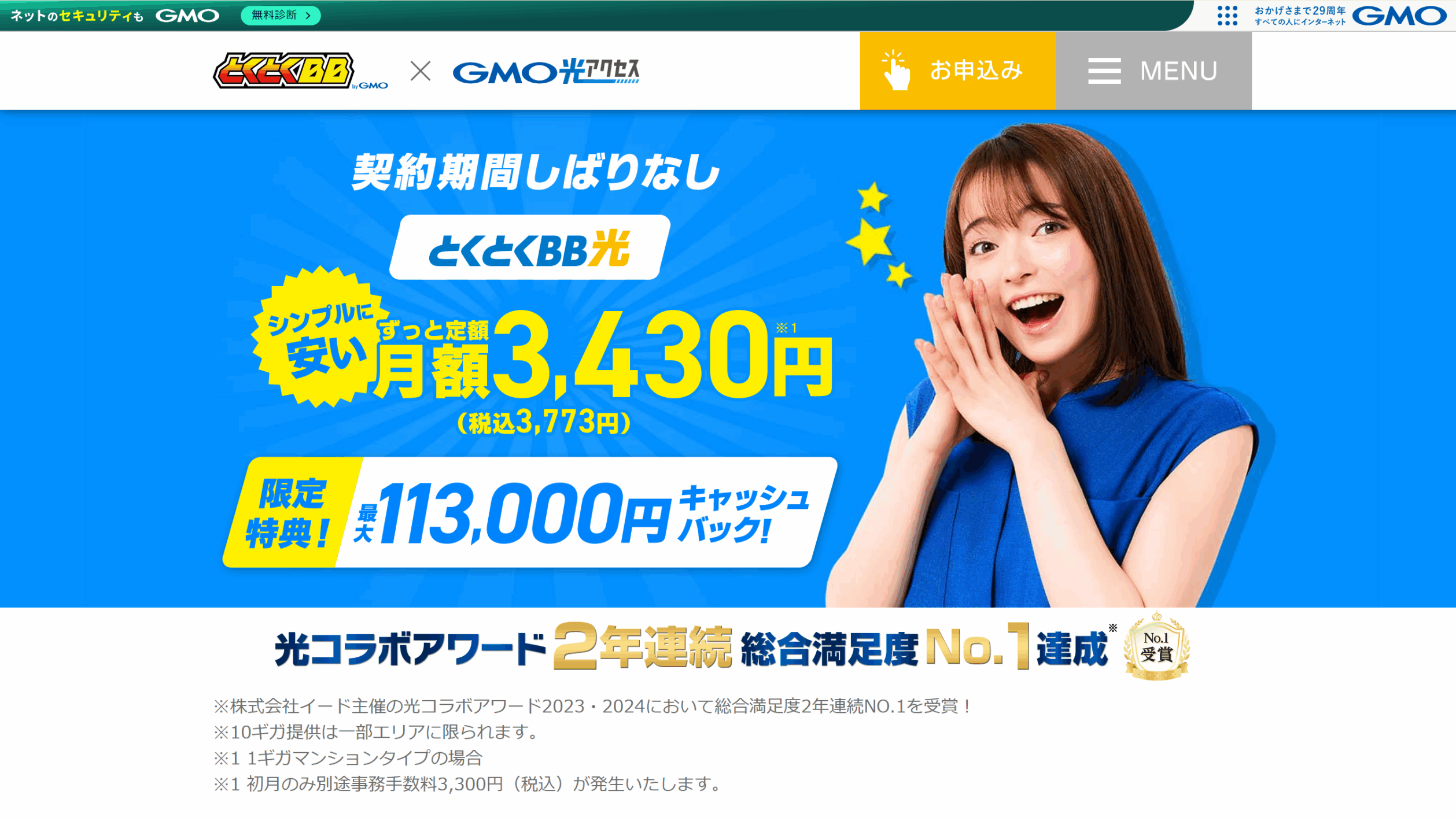 「GMOとくとくBB【GMO光アクセス】」は、速度・安定性・料金のバランスが良く、幅広い用途で快適に使える光回線サービスです。特に、動画視聴やオンライン会議、テレワークなど通信環境の品質が重要な方に最適です。さらに、手厚いサポートとお得なキャンペーンがあるため、初めて光回線を導入する方にもおすすめできます。
