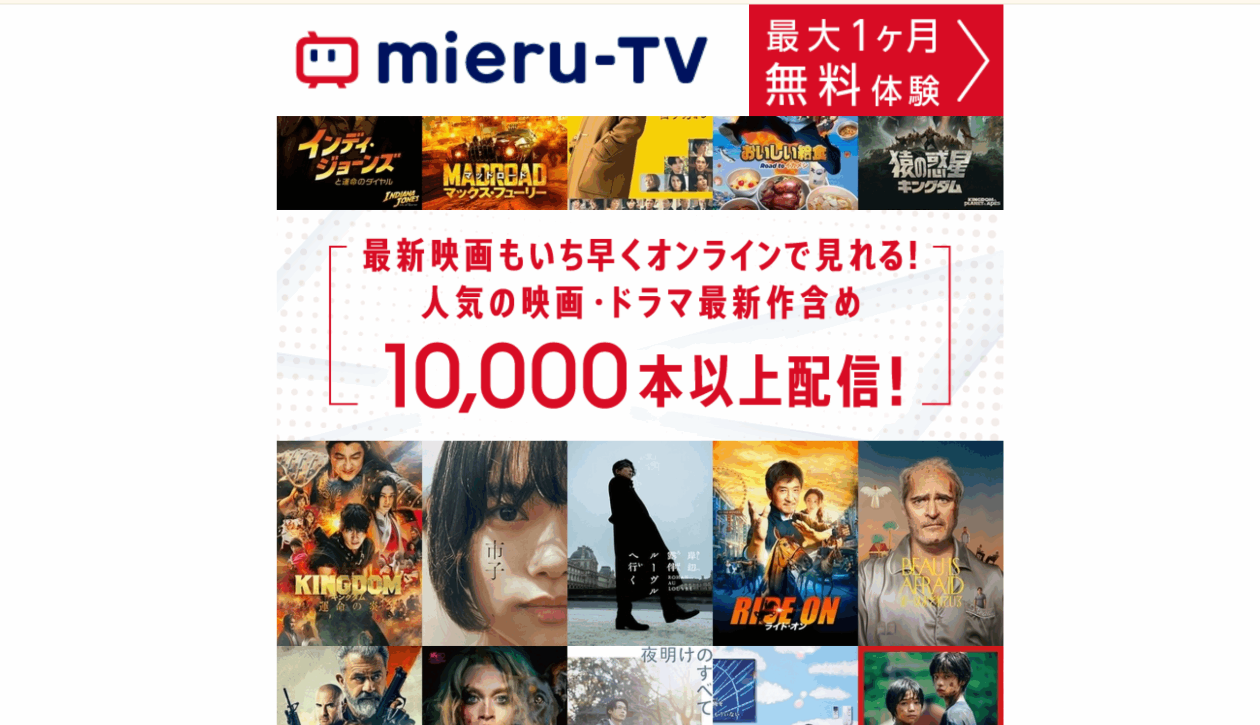 映画・ドラマ・アニメが10,000本以上!月額でお得に見放題【mieru-TV】